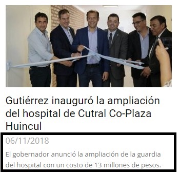 “Sobre la ampliación de la guardia del Hospital de Complejidad. Le dejamos la foto para que lo recuerde: el 6 de noviembre de 2018 usted ‘anunció’ esa obra con un Presupuesto de 13 millones de pesos. Ahora le cuesta 60. Vio que le convenía haberla hecho entonces. Y también a los vecinos de Cutral Co y Plaza Huincul, que esperan a la intemperie en invierno y verano para ser atendidos”, agrega.