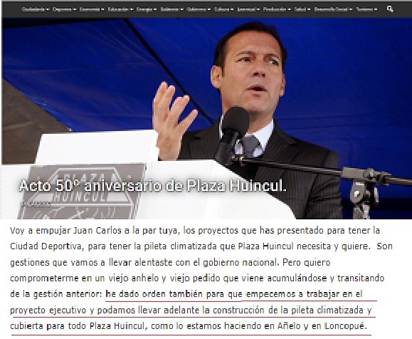 “Se lo decimos con fecha: el 24 de abril de 2016, usted anunció dos cosas: que el sector sur de Plaza Huincul no iba a tener más problemas de agua y una pileta cubierta; está en deuda. Ese día Usted dijo: “he dado orden también para que empecemos a trabajar en el proyecto ejecutivo y podamos llevar adelante la construcción de la pileta climatizada y cubierta para todo Plaza Huincul, como lo estamos haciendo en Añelo y en Loncopué”. Bueno es reconocer: la de Añelo se inauguró el 20 de octubre de 2018, la de Loncopué está en ejecución y casi terminada. La de Plaza Huincul….”, afirma el comunicado firmado por Paladino y Lindor.